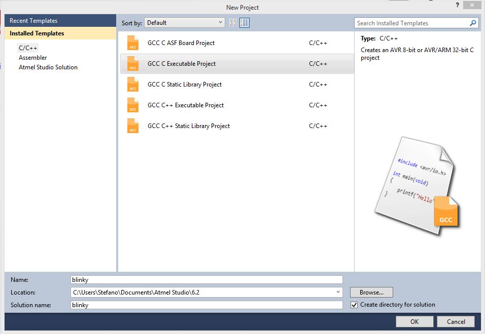 L'unica cosa da fare è metterci un nome significativo nel campo Name, io ho messo blinky e, visto che questo programmino di prova lo scriviamo in C selezioniamo GCC Executable Project. Premiamo il tasto OK ed andiamo avanti.
