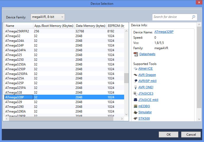 Ora compare la finestra di dialogo per la scelta del micro. Selezioniamo per comodità la famiglia megaAVR, 8-bit dal menù a tendina Device Family posto in alto. Selezioniamo poi ATmega328P come si vede nella foto.