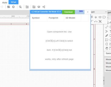 L'estensione funziona solo nella finestra "Librerie", quella che apriamo quando stiamo cercando un componente su EasyEDA. Una volta cercato e provato il componente (o simbolo che sia) semplicemente tenendo premuto il tasto CTRL facciamo click sulla linea interessata della lista e verrà aggiunto nella finestra di LCKiConverter.