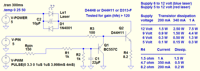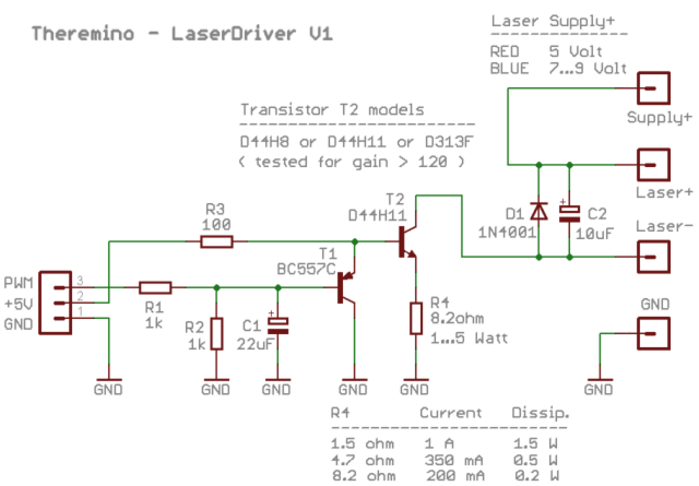 Per far scaldare meno il transistor, non si deve esagerare con la tensione “Laser Supply”. La tensione giusta è la massima tensione richiesta dal laser più due volt. Quindi per i laser rossi, si userà sempre un cinque volt e per quelli viola, otto o nove volt.