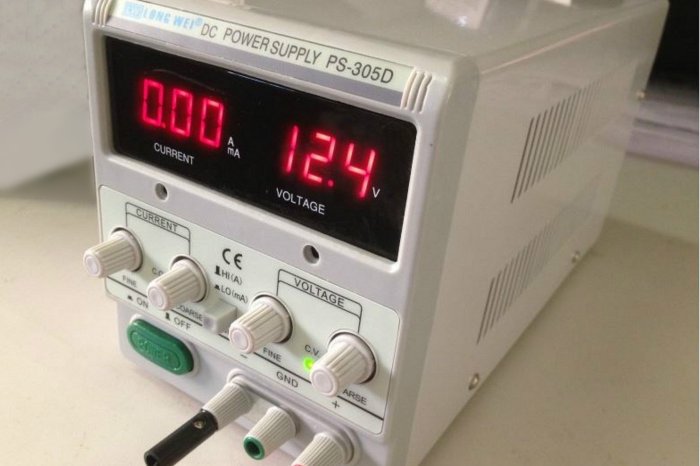 Questi alimentatori hanno due strumenti di misura e due manopole, per regolare la tensione e la corrente massima. Si possono trovare su eBay o Amazon per prezzi che vanno da 40 a 80 Euro.