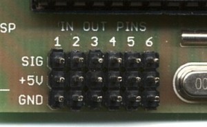 Quelli con i cerchietti bianchi sono i dodici Pin che portano i segnali di ingresso e uscita, chiamati "SIG". Vicino ad essi sono disponibili i collegamenti di massa "GND" e quelli di alimentazione "+5V" e "3.3V". La disposizione dei Pin permette di collegare direttamente i cavetti di gran parte dei sensori e servomotori comunemente usati.