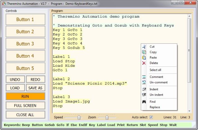 - Il primo non è nemmeno un linguaggio ma semplici pulsanti da cliccare con il mouse o con il touch screen. Ma questi pulsanti sono assai più potenti di quel che può apparire a prima vista. Li si possono configurare come comportamento dimensioni e colore e li si possono disporre in qualunque numero su una finestra. Con questi pulsanti si possono comandare operazioni di automazione anche abbastanza complesse, muovere servomotori con destinazione e velocità variabile ed eseguire altre utili funzioni. La applicazione Theremino Buttons si scarica da questa pagina.