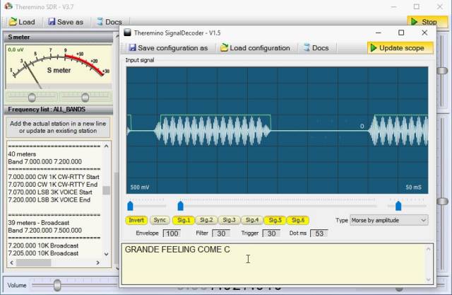 E sempre senza scrivere software si possono combinare sensori, attuatori e applicazioni in ogni modo possibile, per la gran parte nemmeno previsti o immaginati dagli stessi progettisti del sistema. Nella immagine seguente si vede la applicazione Theremino SignalDecoder che decodifica un segnale in codice morse ricevuto da Theremino SDR.