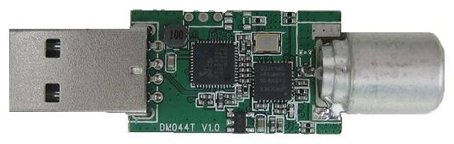 Questo è uno dei tanti modelli di adattatore SDR. Sono dispositivi progettati per ricevere la televisione ma li si può adattare alle nostre esigenze modificando il software che li guida (driver). Come si può vedere oltre all'ADC c'è ben poco, appena quel che serve per collegarsi alla porta USB e stabilizzare i 5 volt.