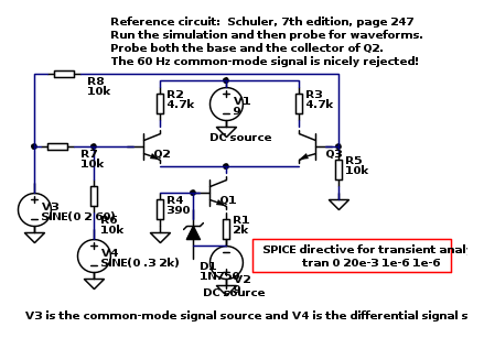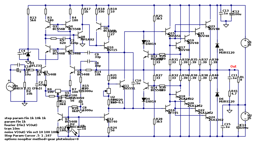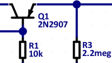Come si vedrà nei seguenti esempi i transistor della libreria sono troppo piccoli (si vedono due piccole interruzioni sui terminali di collettore e emettitore). Per ora abbiamo usato solo componenti delle librerie standard che si scaricano con la normale distribuzione di FidoCadJ. Ma tutto il meccanismo di espansione delle librerie è pronto e ben testato. Per cui in futuro chiunque potrà migliorare la conversione e ottenere schemi perfetti correggendo i componenti peggiori. Non si tratta di rifarli tutti, la gran parte vanno già bene come sono.