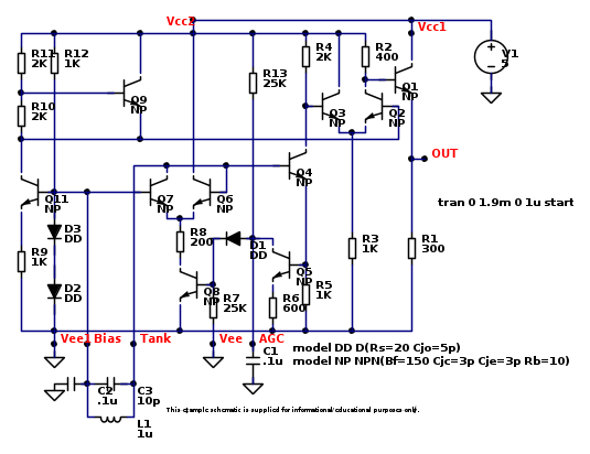 Questo è un MC1648, un oscillatore molto simpatico, una specie di 555 per gli oscillatori sinusoidali in HF. La conversione è perfetta tranne i per i parametri dei componenti posizionati male, come spiegato nei paragrafi precedenti. I colori che si vedono sono gli strati di FidoCadJ e sono definibili nel file di opzioni, cosi come il "font" e le dimensioni dei caratteri.