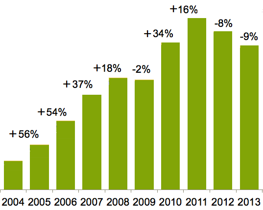 E non è accaduto solo in Italia, la prossima immagine (inedita ma basata su dati sicuri) mostra gli investimenti globali nelle rinnovabili. La crescita si è arrestata nel 2012 e oggi (2017) siamo più o meno ai livelli del 2011.