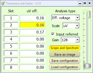 Il rumore è stato misurato con il preamplificatore programmabile impostato per un guadagno di 128, con ingressi differenziali e 600 SPS (campionamenti al secondo). Quindi in condizioni di normale uso e con il massimo guadagno.