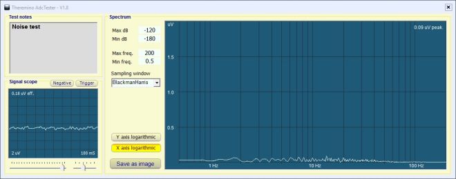 Abbiamo verificato (con il software Theremino AdcTester appositamente scritto per collaudare gli Adc), che il rumore introdotto dai resistori da 220 ohm fosse limitato e comportasse un degrado di prestazioni trascurabile.
