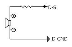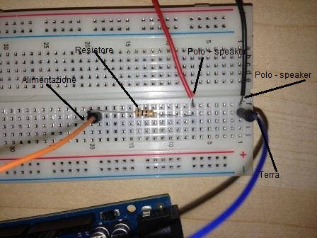 Adesso passiamo all'assemblaggio della parte di circuito comprendente lo speaker. Si collega il polo positivo dello speaker piezoelettrico, tramite un resistore da 100Ω ad un pin I/O DIGITALE: il pin 8. Mentre il polo negativo dello speaker viene collegato direttamente alla "terra" che si trova sempre sul lato dei connettori I/O DIGITALI.