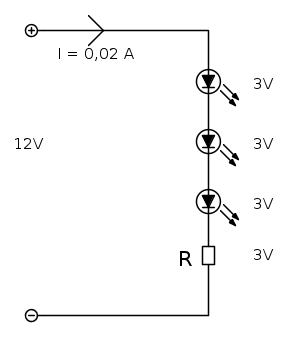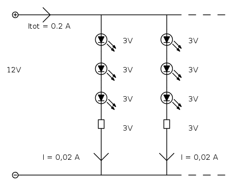 Avendo scelto come alimentazione un valore di 12 V, erogata come precedentemente descritto, si ricava facilmente lo schema della singola serie di led.