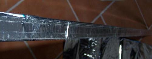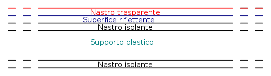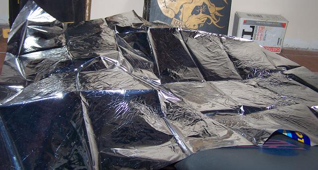 Per fissarla ho utilizzato uno strato di collante leggero (ovviamente il meno infiammabile possibile!); ed uno strato di nastro adesivo trasparente, che aumenta ulteriormente l'effetto riflettente.