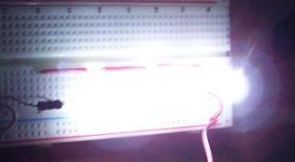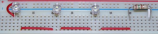 Prima di tutto ho montato sulla breadboard una singola fila di led con relativa resistenza per testare se il tutto funzionava; questo per il fatto che 98 volte su 100 la teoria ci prende, ma si può sempre cadere in quel misero 2%...