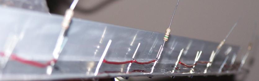 Si potrebbero fare delle piccole piazzole di mille fori, una per ogni led e resistenza, ma ho trovato più pratico saldare direttamente i fili ai singoli piedini dei componenti.