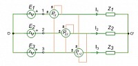 La scelta del metodo risolutivo ricade su quello "dei potenziali ai nodi" molto piu' facile da implementare rispetto a quello "delle correnti di maglia"; si tratta di trasformare ogni ramo nel circuito equivalente secondo Norton-Mayer; parallelo fra generatore di corrente Jeq e impedenza equivalente Zeq.