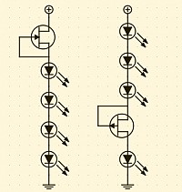 Quando e` necessario accendere un numero elevato di led, e` conveniente, dal punto di vista del rendimento complessivo, collegarli in serie. In questa maniera e` possibile usare un solo circuito di controllo della corrente che alimenta una stringa di led.