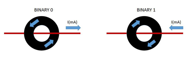 Guardando un nucleo poggiato davanti a noi ed avendo il filo uscente dal nucleo e diretto verso di noi, abbiamo un 1 binario se la corrente è entra nel nucleo e uno 0 se la corrente è uscente, si ribadisce che questa è una convenzione per questo progetto, quindi non bisogna assumerla per altri progetti simili o per eventuali moduli di core-memory prodotti da aziende specializzate.