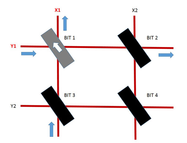 scrittura di un 1 binario sul nucleo BIT1, impulso elettrico su X1 e Y1, contemporaneamente lettura sul sense wire,