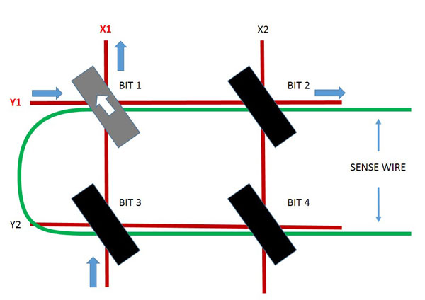 La magnetizzazione del nucleo avviene per induzione, al passare di un impulso elettrico nei fili che attraversano il nucleo, questi fili sono gli address wire, gli indirizzi della memoria, ci torneremo più tardi.Se consideriamo un array di memoria costituito da 4 bit, possiamo vedere come avviene l’indirizzamento di un bit di memoria, per leggere o scrivere su un nucleo dobbiamo inviare un impulso di corrente all’indirizzo voluto, nell’esempio X1-Y1, in questo modo magnetizziamo il nucleo in senso orario (binario 1) o in senso antiorario (binario 0). Nell’esempio riportato il senso delle correnti fa in modo che il bit numero 1 sia magnetizzato come uno 0 binario (senso di rotazione del flusso magnetico antiorario).