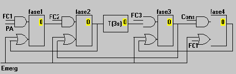 Si noti che la la fase successiva (fase2) sarà attivata quando sarà raggiunto il finecorsa FC2, e che questa attivazione comporta il Reset della fase1. Nella fase2 viene attivato un temporizzatore che darà il comando di movimento solo dopo 3 s, per raggiungere la posizione del finecorsa FC3. Raggiunto questo si entra in una fase di attesa (fase3) di un "Consenso a proseguire", per attivare la fase4, che fa tornare al punto di partenza (FC1).
