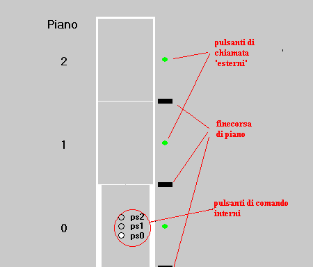 Come si può vedere dalla figura, l'ascensore simulato si muove fra 3 piani, comandato dai "pulsanti" indicati (per comandarli, fare click con il mouse).All'interno si "accende" (bianco) il pulsante relativo al piano in cui si trova l'ascensore.