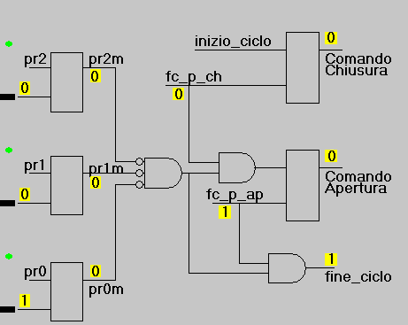 E' poi ovvio che il movimento deve arrestarsi in corrispondenza del piano prenotato, e qui avviare il comando di apertura porta. Il ciclo termina quando la porta si è aperta completamente (fc_p_ap)..