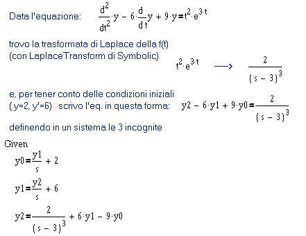 Chiudo la serie di esempi di calcolo simbolico con un'applicazione delle Trasformate di Laplace ad un'equazione del secondo ordine (è superfluo sottolineare che anche le trasformazioni vengono ottenute direttamente dalle speciali funzioni di Symbolic in MathCad).