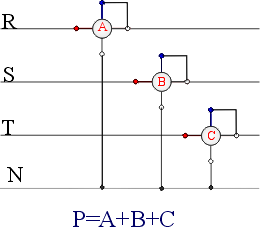 Per la misura della potenza attiva in un sistema trifase è sufficiente misurare la potenza di ogni fase, quindi effettuare la somma delle indicazioni. Questo vale sia per sistemi simmetrici ed equilibrati che dissimmetrici e squilibrati. E' evidente che se il sistema è simmetrico ed equilibrato è sufficiente misurare la potenza attiva di una fase, quindi moltiplicarla per tre. La figura che segue mostra la misura in un sistema a quattro fili.