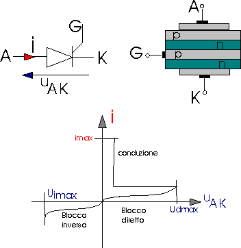 E' un dispositivo a quattro strati, quindi con tre giunzioni PN, nel quale la conduzione tra anodo A e catodo K, collegati agli strati esterni, è controllata da un impulso di corrente fornito ad un terzo elettrodo, detto Gate, collegato allo strato P interno, come illustrato in figura 2. Se la tensione UAK è negativa (polarizzazione inversa), inferiore comunque ad un valore massimo Ui,max, la conduzione è bloccata: transita solo una debole intensità ed un eventuale impulso sul gate non ha effetto. Anche see UAK è positiva (polarizzazione diretta), ed inferiore ad un valore massimo Ud,max analogo a quello che determina la scarica a valanga nella polarizzazione inversa, , non si ha conduzione. Questa però può essere innescata da un impulso di corrente sul gate. Una volta che il tiristor è entrato in conduzione permane in questo stato indipendentemente dallo stato del gate, che ne perde il controllo. Il tiristor ritorna in situazione di blocco solo quando l'intensità di corrente tra anodo e catodo, per una qualsiasi ragione, si annulla. Nella figura 2 è mostrata la caratteristica i, UAK.