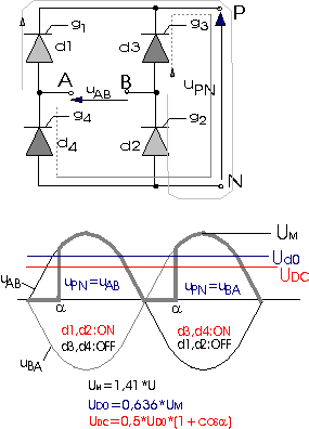I quattro tiristor formano i lati di un quadrilatero alimentato tra i vertici A e B dalla tensione alternata. Per semplicità pensiamo ad un carico puramente resistivo applicato tra i punti P ed N. Quando uAB è positiva d1 e d2 sono polarizzati direttamente, ed un impulso sul loro gate li manda in conduzione mentre d3 e d4, polarizzati inversamente, non conducono. La tensione tra P ed N coincide con la uAB. Quando uAB è negativa (uBA positiva) sono d3 e d4 ad essere polarizzati direttamente per cui un impulso sul loro gate li manda in conduzione mentre d1 e d2 sono polarizzati inversamente e non conducono. La tensione tra P ed N coincide ora con la uBA: P è perciò sempre positivo rispetto ad N e la tensione sul carico è unidirezionale, con valore medio, UDC , regolabile variando l'istante in cui si dà l'impulso di conduzione definito dall'angolo a.
