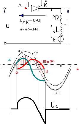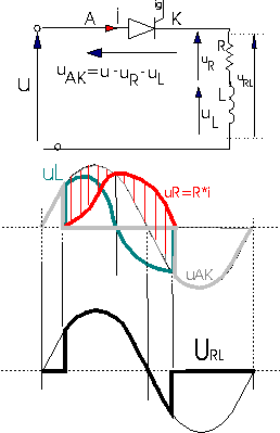Dall'istante in cui il tiristor aveva iniziato a condurre fino a quello in cui la conduzione cessa, al bipolo R-L è applicata la tensione u. Quando la corrente si annulla si annulla anche la tensione sul carico R-L. Esiste dunque una frazione di periodo in cui la tensione ai capi del carico è negativa mentre la corrente è ancora positiva. E' l'intervallo compreso tra l'istante in cui u diventa negativa e l'istante in cui uL diventa uguale ad u, mentre uAK è nulla, cioè l'istante in cui i, quindi uR si annullano. In questa frazione di periodo il carico restituisce energia al generatore.