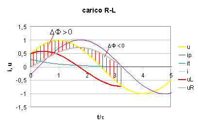 La figura 7 mostra i grafici della corrente e delle tensioni di un circuito ohmico-induttivo all'inserzione di una fem sinusoidale u quando essa è a metà del valore massimo (angolo di fase = 30°). Si ricorda che la corrente nel transitorio che ne consegue è la somma della componente a regime permanente ip e di una transitoria smorzata it: i=ip+it. La tensione uR=R*i mentre la tensione sull'induttanza è uL=L*di/dt=u-uR. All'istante di inserzione, dovendo essere i=0 è it=-ip. Osserviamo che la corrente parte da zero e si annulla quando l'area tratteggiata a destra eguaglia quella di sinistra. Le due aree rappresentano l'incremento ed il decremento di flusso magnetico dovuto alla corrente che dapprima cresce e poi cala, portando l'energia immagazzinata nel campo magnetico ad un massimo, richiedendola al generatore di alimentazione, e poi restituendola integralmente. Le due aree sono date dalla differenza u-uR=uL, quindi all'area sottesa dalla curva di uL.