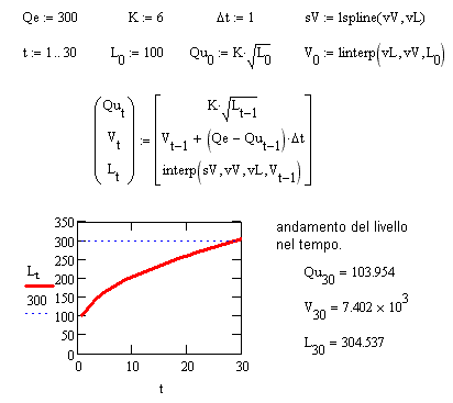 Il problema sarebbe semplice se non ci fossero due tipi di complicazioni. La prima è che il livello L è una funzione del volume V accumulato, non esprimibile matematicamente. I dati del volume sono infatti stati valutati dall'orografia della zona a livelli di 1, 2 e 3 m, quindi dovranno essere opportunamente interpolati per ricavare i valori intermedi. La più semplice forma di interpolazione è quella lineare e qualsiasi calcolatore dotato di ambiente matematico evoluto (quale ad es. MathCad, che qui verrà usato) potrà svolgere facilmente questa funzione. Eccone lo svolgimento: