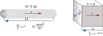 La resistività r di un materiale, che è l'inverso della conducibilità, se espressa nel sistema SI in W m (ohm m) è la resistenza che presenta un pezzo di quel materiale avente sezione di A=1 m2 e lunghezza l=1 m, cioè un cubo di lato un metro. Per i conduttori è preferibile usare un suo sottomultiplo, un milione di volte più piccolo, il mW m che si può anche scrivere W mm2 / m, che è l'unità usata in figura. La resistività espressa in tale unità è la resistenza di un filo lungo un metro e di sezione pari ad un millimetro quadro. Il numero che la esprime è un milione di volte maggiore di quello espresso nell'unità del sistema internazionale