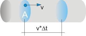 Considerato un tratto del conduttore rappresentato in figura, in cui si ha una corrente dovuta alla velocità di deriva v del gas elettronico, nel tempo Dt attraverso la sezione A sono transitate tutte le cariche che si trovano nel volume compreso tra le due sezioni azzurre. La carica che vi corrisponde è