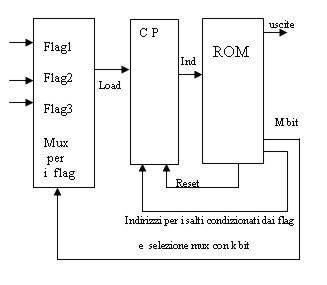 Crescono gli anelli di reazione come le banane sugli alberi. Non fate i grossi! . In sostanza cambia solo il contatore. Quando il segnale di Load si attiva, perché nella rom, in quel bit di Load non c' è più 0 ma 1, allora il contatore non prosegue nella sequenza normale, ma, senza alcuna condizione, carica l'indirizzo, sempre scritto nella cella della rom, portato dalle linee per i salti incondizionati e poi va avanti di lì. E' ovvio che la rom deve avere un numero di uscite adeguato. Possiamo già notare che sulle piste di collegamento viaggiano tre informazioni nettamente distinte: i dati (in questo caso in sola uscita, è una Read Only Memory, ricordate?), gli indirizzi, di salto o meno, e linee tipo load e reset che vengono dette di controllo.