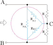 A volte però ci si imbatte in reti in cui non è possibile individuare né resistenza in serie, né resistenze in parallelo com'è il caso della rete di figura ( nota con il nome ponte di Wheatstone)
