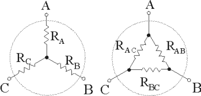 Un triangolo è un tripolo costituito da tre resistenze collegate una di seguito all'altra formando una figura chiusa. I tre punti di connessione delle resistenze sono assimilabili ai vertici di un triangolo e sono collegati a punti di diverso potenziale.