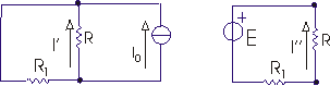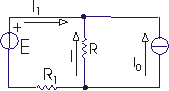 I=(-I0*R1-E)/(R1+R)= - I0*R1/(R1+R) - E/(R1+R)