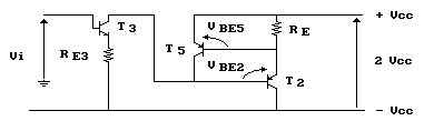 Vediamo, infatti, che se l'uscita viene connessa direttamente a massa lo è anche l'emettitore di T5 che, a meno delle cadute di tensione VBE5 e VBE2, porta a potenziale di massa il collettore di T3. In questa situazione tutta la tensione di alimentazione -VCC verrebbe a trovarsi su T2 ed RE3. A questo proposito consideriamo l'equazione alla maglia formata dai transistor T3, T4 e T5 con l'uscita cortocircuitata a massa, avremo: