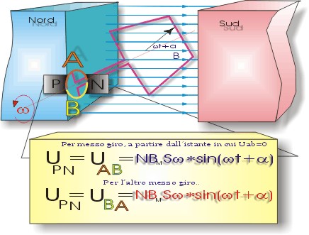 dove S è l'area della superficie delle spire, N il numero delle spire della bobina, w la velocità angolare di rotazione della bobina, wt+a l'angolo tra la perpendicolare alla superficie delle spire e le linee di forza