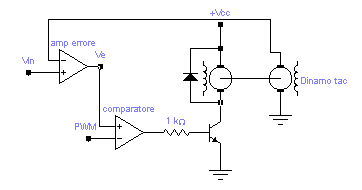 L'amplificatore di errore ha in ingresso la differenza fra Vin ed E = k n . Se il motore rallenta, la tensione errore amplificata Ve aumenta e l'istante in cui l'onda a dente di sega PWM raggiunge Ve ritarda. In tal modo il duty-cycle aumenta permettendo al motore il recupero della velocità persa.