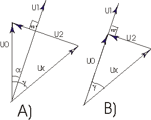Il metodo di proiezione confronta due tensioni sinusoidali isofrequenziali; U0 che supponiamo nota ed Ux incognita, in modo tale che la condizione di equilibrio sia raggiunta quando le proiezioni dei loro vettori rappresentativi secondo una direzione prefissata sono uguali. Se g � l�angolo di sfasamento tra le due tensioni ed a l�angolo di tra la tensione U0 e la direzione di riferimento si ha U0*cosa = Ux*cos(g-a).Ci�, come mostra la figura A, equivale a dire che la differenza vettoriale tra le due tensioni � in quadratura con una tensione sinusoidale U1 il cui vettore rappresentativo stabilisce la direzione di riferimento.