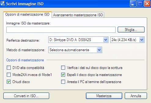 Ho selezionato l'opzione "Masterizza immagine ISO" e scelto il file ISO di PM (prima copiato e disponibile sullo stesso HD). Questa è la finestra che consente di procedere alla selezione del file e di avviare la scrittura sul supporto: