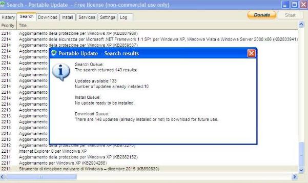 Fatto questo (purtroppo non ricordo se si apre direttamente l'interfaccia di seguito riportata o se per ottenerla sia necessario attivare di nuovo l'eseguibile di PU) si passa alla fase di ricerca. Si avvia la procedura dando lo Start dalla cartella "Search", si ripete il comando per rendere operativa l'acquisizione, previa visualizzazione della cartella di "Download", e per finire si autorizza lo svolgimento della installazione, con quella di "Install". Ad esclusione della "Install" è ovviamente necessario rimanere sempre collegati alla rete. Se tutto va per il verso giusto l'aggiornamento è fatto. Questo, ad esempio, è l'output restituito a seguito dello Start eseguito dalla cartella "Search", le altre due cartelle sono simili: