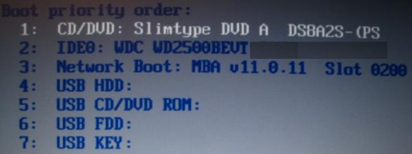 Fedelmente a quanto sopra riportato ho provveduto alla sostituzione dello HD difettoso, con uno nuovo (della medesima capacità), e al riavvio, accedendo alla configurazione del BIOS (generalmente si "entra" in tale modalità tenendo premuto all'accensione il pulsante F2, ma qui dipende dal PC) ho modificato la sequenza di avvio ("boot sequence"). Il BIOS, lo sappiamo, è il firmware presente sulla scheda madre del PC, c'è, è lì, non occorre "caricalo", però gli si può far sapere dove preferiamo lui vada a "pescare" l'OS e, per questo, tra le varie impostazioni (del BIOS) c'è anche quella relativa all'ordine sequenziale della scelta del supporto che dovrebbe/potrebbe contenere, appunto, l'OS. Il supporto può essere, per esempio, l'HD, un DVD o una PenDrive USB, ma noi, alla prima posizione dell'elenco, ci andiamo a mettere il lettore ottico. Questo di seguito è un esempio, qualcosa di simile potete osservarlo sul vostro PC: