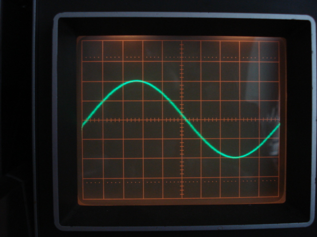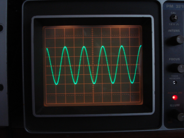 Nell'immagine che segue si vede in tutta la sua magnificenza, visualizzato sul mio vecchio oscilloscopio Philips da 50MHz, un solo periodo del segnale sinusoidale a 500MHz con la base dei tempi regolata per 200 ps/Div.