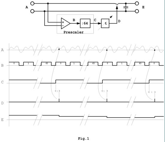 In sostanza lo stretto impulso “D” si presenta ogni sessantaquattro periodi del segnale di ingresso e risulta sfasato rispetto al suo passaggio per lo zero di un tempo “t” regolabile.