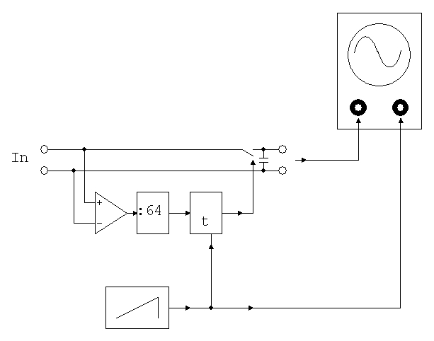 Un circuito semplice, almeno concettualmente, basato sull’uso del prescaler, che sia in grado di catturare il valore di tensione in un preciso punto del periodo del segnale in ingresso ad alta frequenza, è di seguito rappresentato.